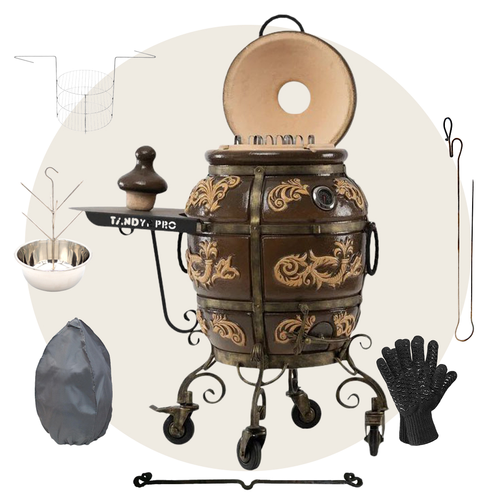 тандыр, шампуры, кочерга, совок, колосник, приспособление для подвешивания шампуров, термометр, столик, колёса - 4 шт., чехол на тандыр, этажерка 3-х ярусная большая, ёлочка 28 см с высоким бортом, шампур двойной, перекладина, перчатки
