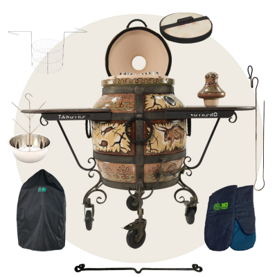 тандыр, шампуры, кочерга, совок, колосник, приспособление для подвешивания шампуров, термометр, жароотсекатель, стойка-подставка, столик - 2 шт., колёса - 4 шт., чехол на тандыр, этажерка 3-х ярусная большая, ёлочка 28 см с высоким бортом и т.д.