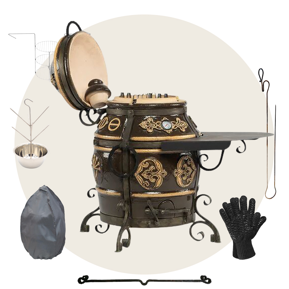 тандыр, шампуры, кочерга, совок, колосник, приспособление для подвешивания шампуров, термометр, столик, чехол на тандыр, этажерка 3-х ярусная средняя, ёлочка 21 см с высоким бортом, шампур двойной, перекладина, перчатки