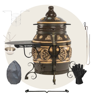 тандыр, шампуры, кочерга, совок, колосник, приспособление для подвешивания шампуров, термометр, столик, чехол на тандыр, этажерка 3-х ярусная средняя, ёлочка 21 см с высоким бортом, шампур двойной, перекладина, перчатки