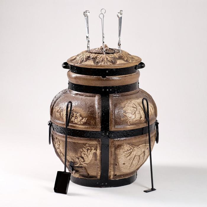 Тандыры изготавливаются гончарными мастерами. Каждое изделие уникально и эксклюзивно. Качество таких приборов проверяется вручную. Каждый сосуд для тандыра прогревается последовательно до 1200°C. Поверх сосуда устанавливается обод с элементами ручной ковки.