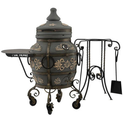 тандыр, шампуры, кочерга, совок, колосник, приспособление для подвешивания шампуров, термометр, жароотсекатель, стойка-подставка, столик, колёса - 4 шт.