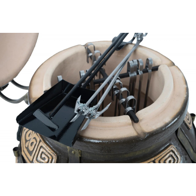 тандыр, шампуры, кочерга, совок, колосник, приспособление для подвешивания шампуров, термометр, жароотсекатель, столик - 2 шт., колёса - 4 шт.