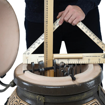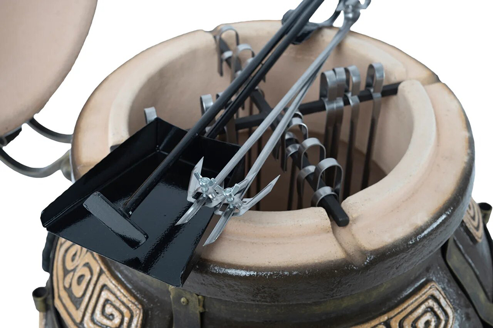 тандыр, шампуры, кочерга, совок, колосник, приспособление для подвешивания шампуров, термометр, жароотсекатель, столик