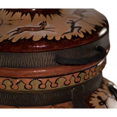 Ещё один эксклюзивный тандыр, выполненный по технологии графика, тандыр "ЭКОтандыр-Шульган-Таш". Ореховый, умбра, махагон, кофе с молоком — эти и другие оттенки коричневой цветовой гаммы делают тандыр "ЭКОтандыр-Шульган-Таш" таким домашним и уютным. Художники-керамисты изобразили на нём не только этнические узоры, но и сцены, где первобытные охотники с луками добывают буйвола, оленя и других зверей. Изображения словно намекают: эксклюзивный тандыр идеален для запекания мяса. Оно почти моментально покрывается лёгкой румяной корочкой, словно запечатывается: благодаря этому мясо приобретает ту самую знаменитую мягкость и сочность. Именно в тандыре Вы приготовите и чудесные пышные лепёшки, и сочные поджаристые овощи — вот лучшая компания для мясных блюд. Выбирайте любые сценарии для своих лучших вечеров у атмосферного тандыра "ЭКОтандыр-Шульган-Таш" и создавайте отличное настроение. Миксуйте сочетания, впечатляйтесь вкусами!