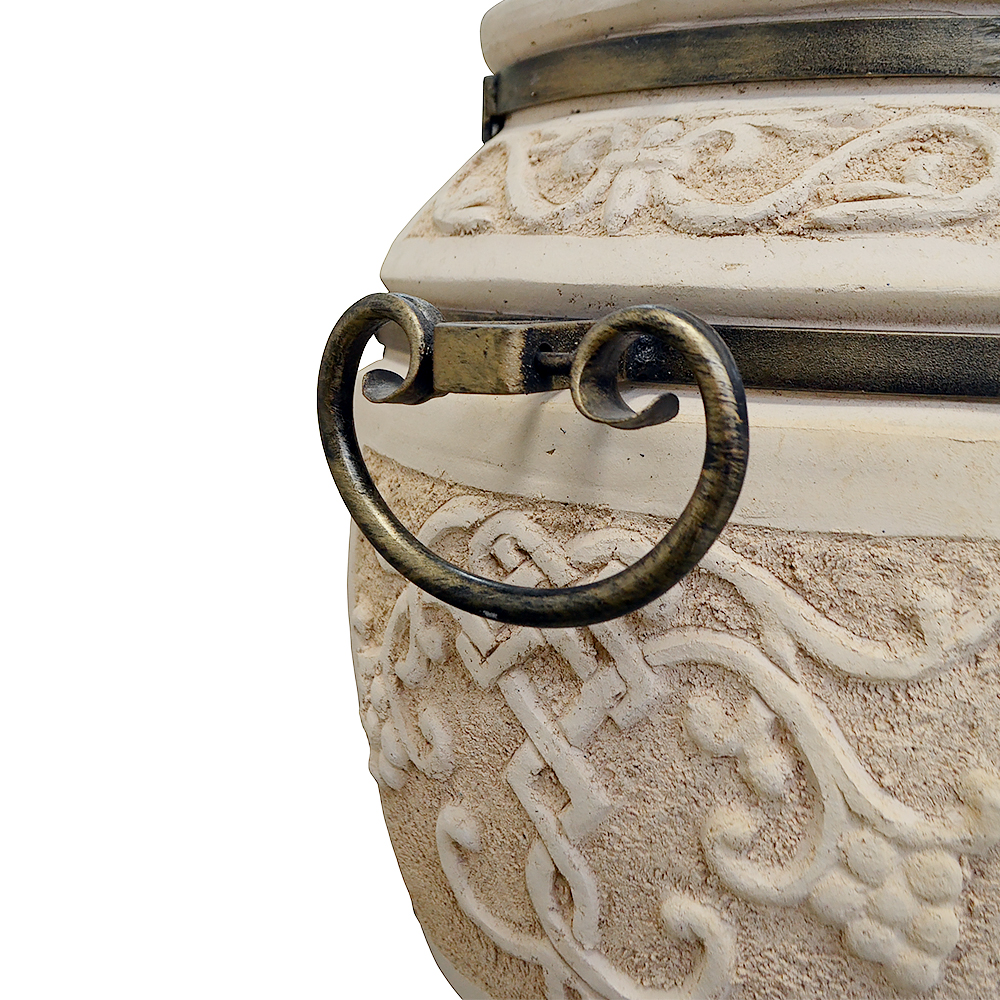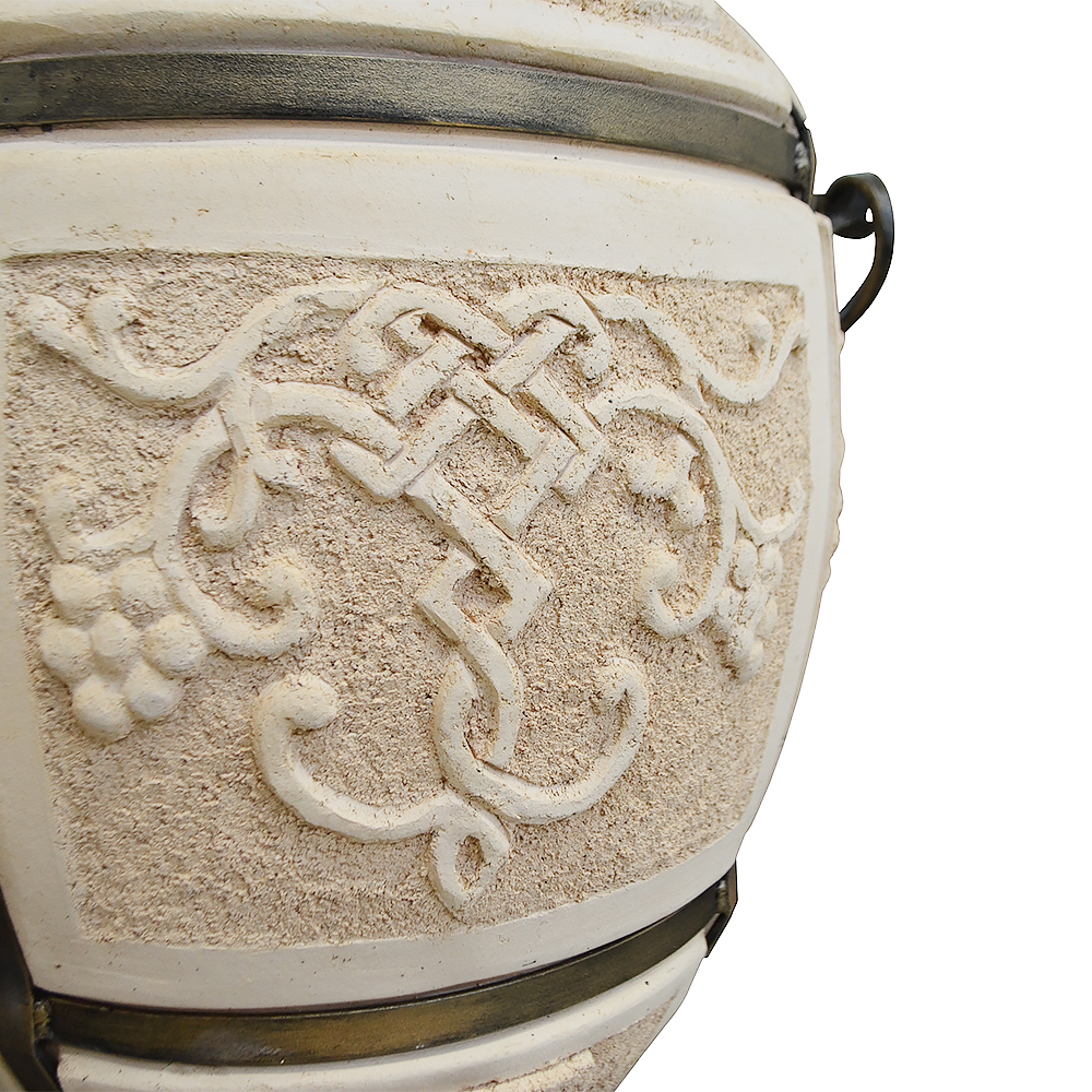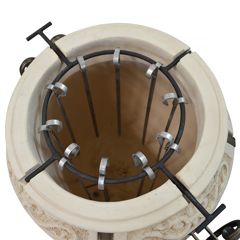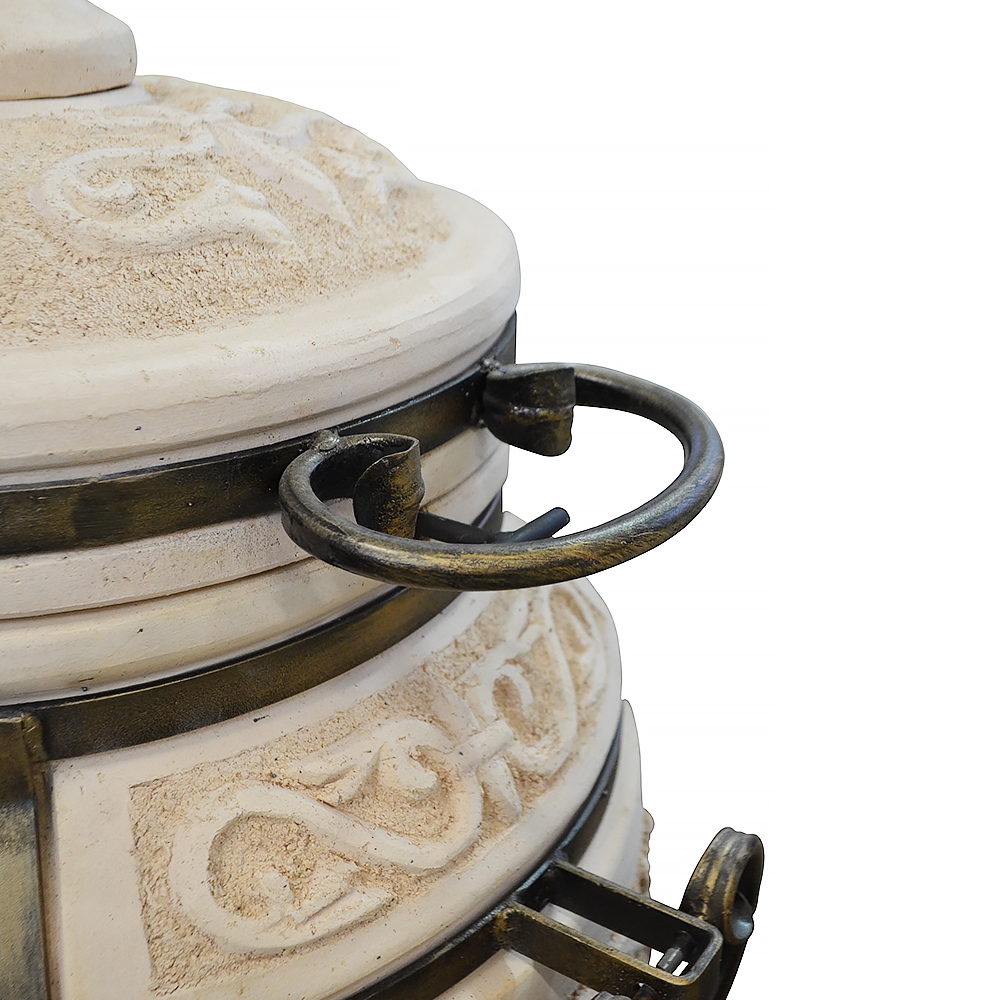 Тандыр изготовлен вручную из натуральной шамотной огнеупорной глины. Для максимальной надёжности тандыр обтянут в металлический каркас, при изготовлении которого используются элементы ковки.